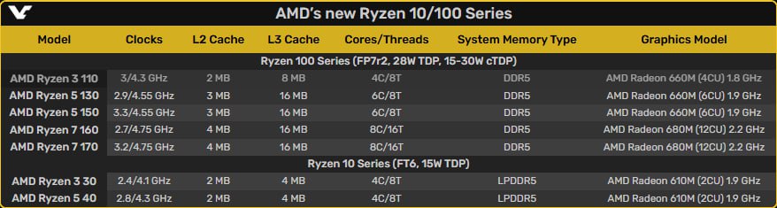 Серия Ryzen 100 получила пять моделей. Флагманом стал Ryzen 7 170: 8 ядер, 16 потоков, 16 МБ L3, 4,75 ГГц и интегрированная графика Radeon 680M с 12 RDNA 2 блоками (ранее Ryzen 7 7735HS). Остальные — Ryzen 7 160, Ryzen 5 150, Ryzen 5 130 и Ryzen 3 110 — тоже являются аналогами существующих мобильных чипов Ryzen 7000.